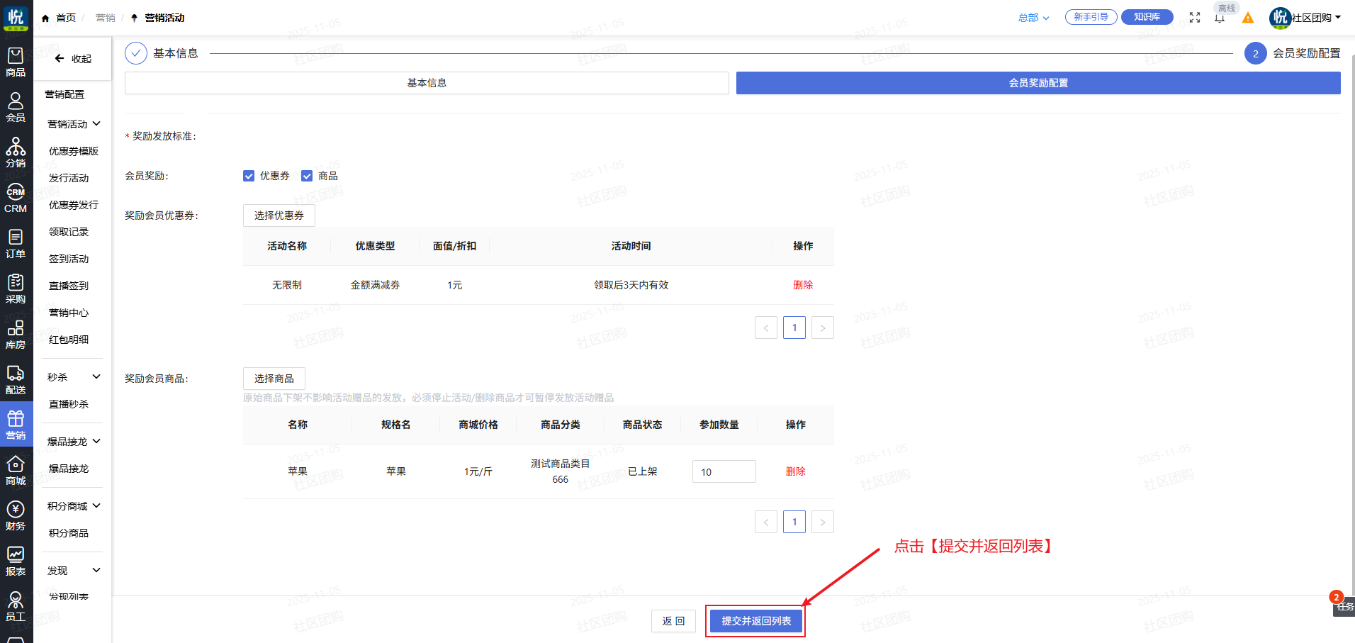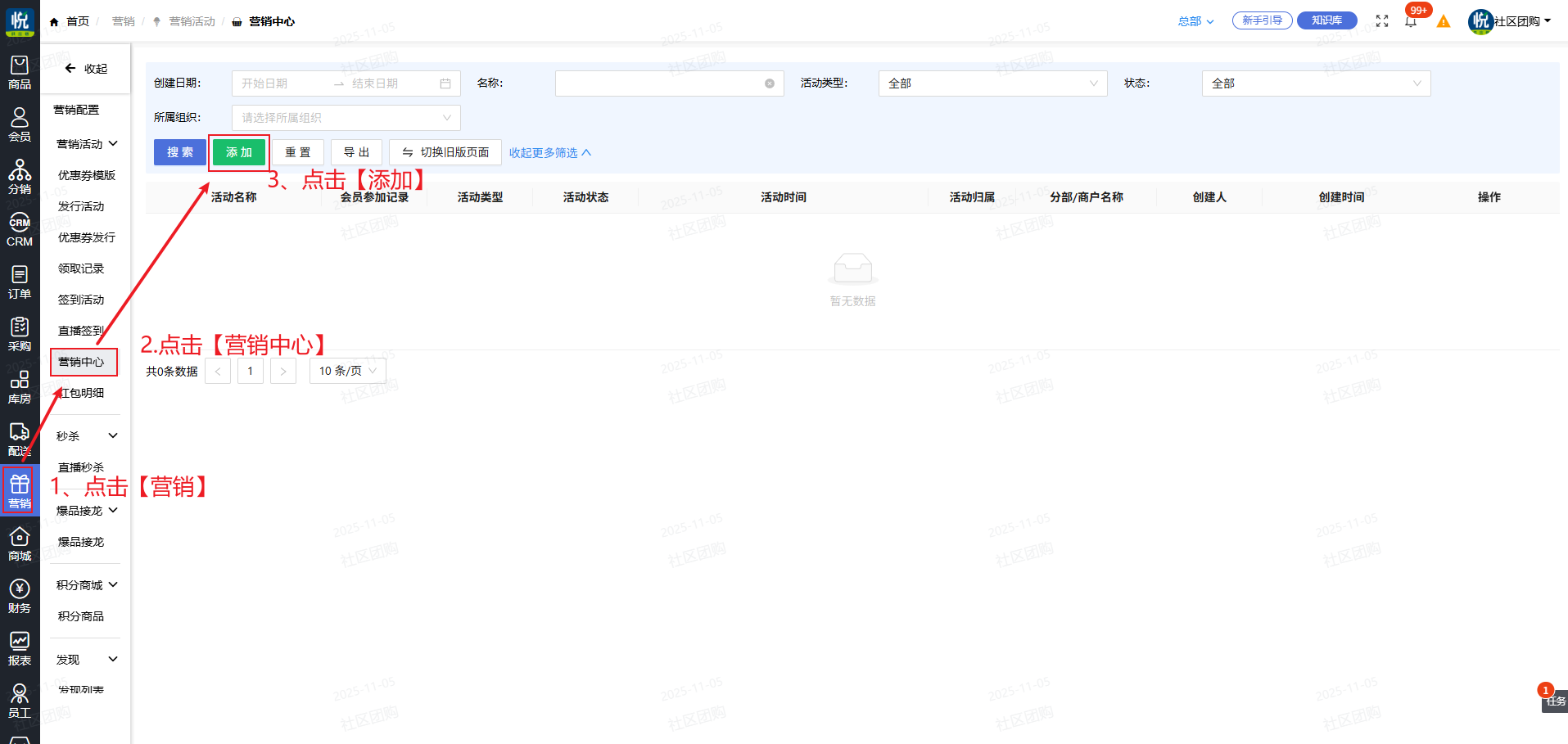 1.登录系统后台,左侧导航栏点击【营销】-【营销中心】-【添加】,不支持收银台购买商品赠送优惠券/商品