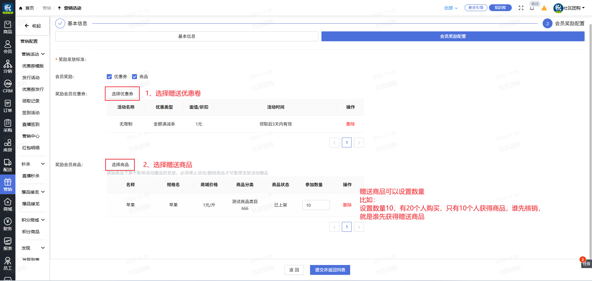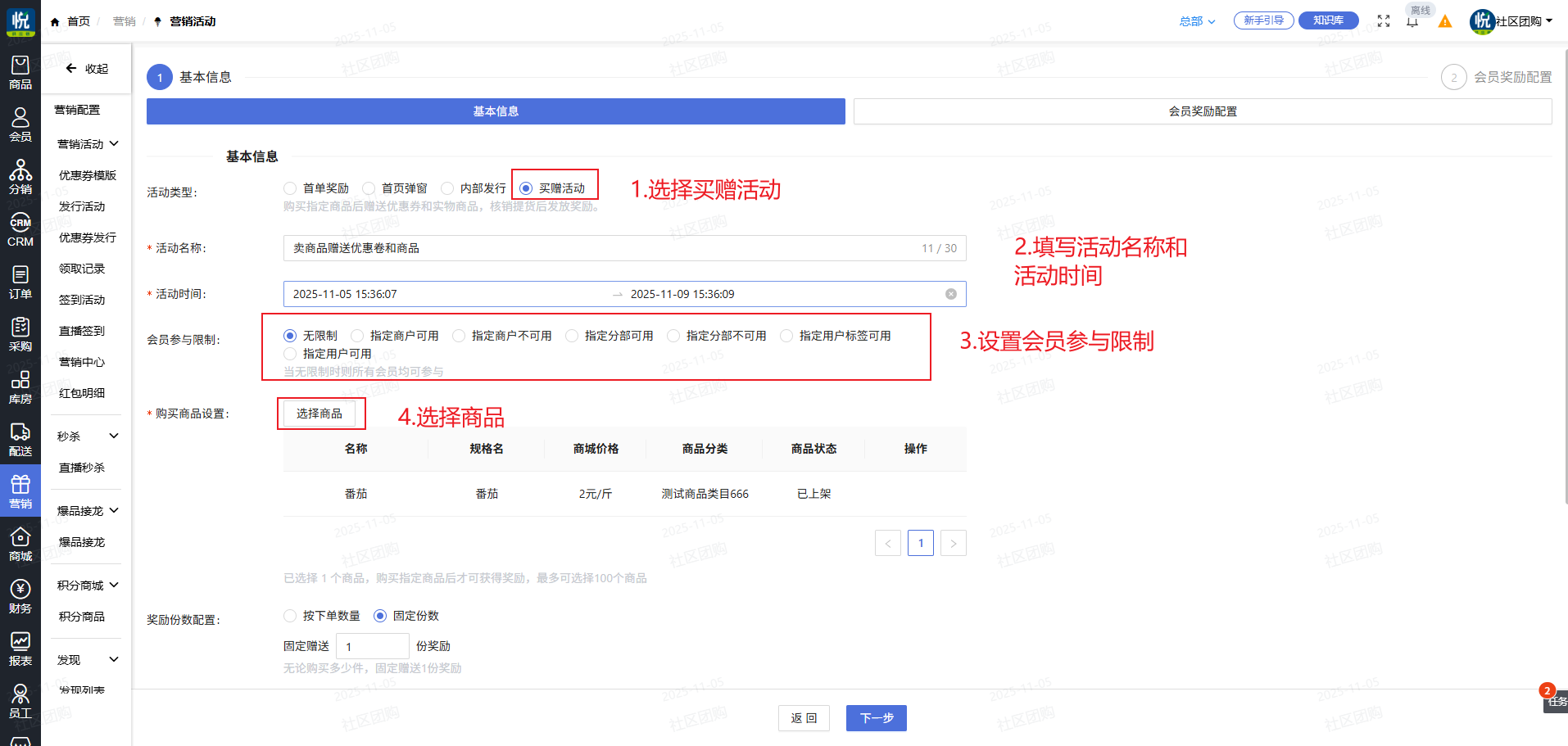 2.选择【买赠活动】,填写活动名称和活动时间,设置会员参与限制,选择商品