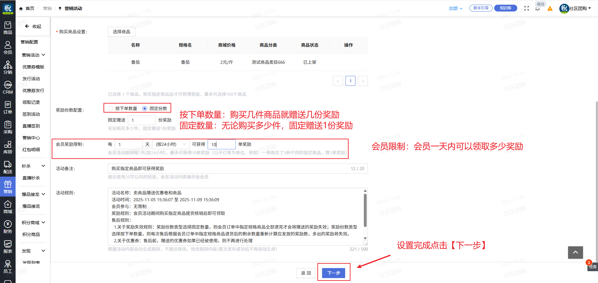 3.根据实际情况选择【按下单数量】或者【固定数量】,填写会员奖励数量