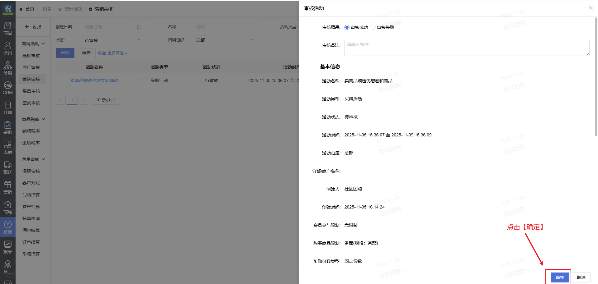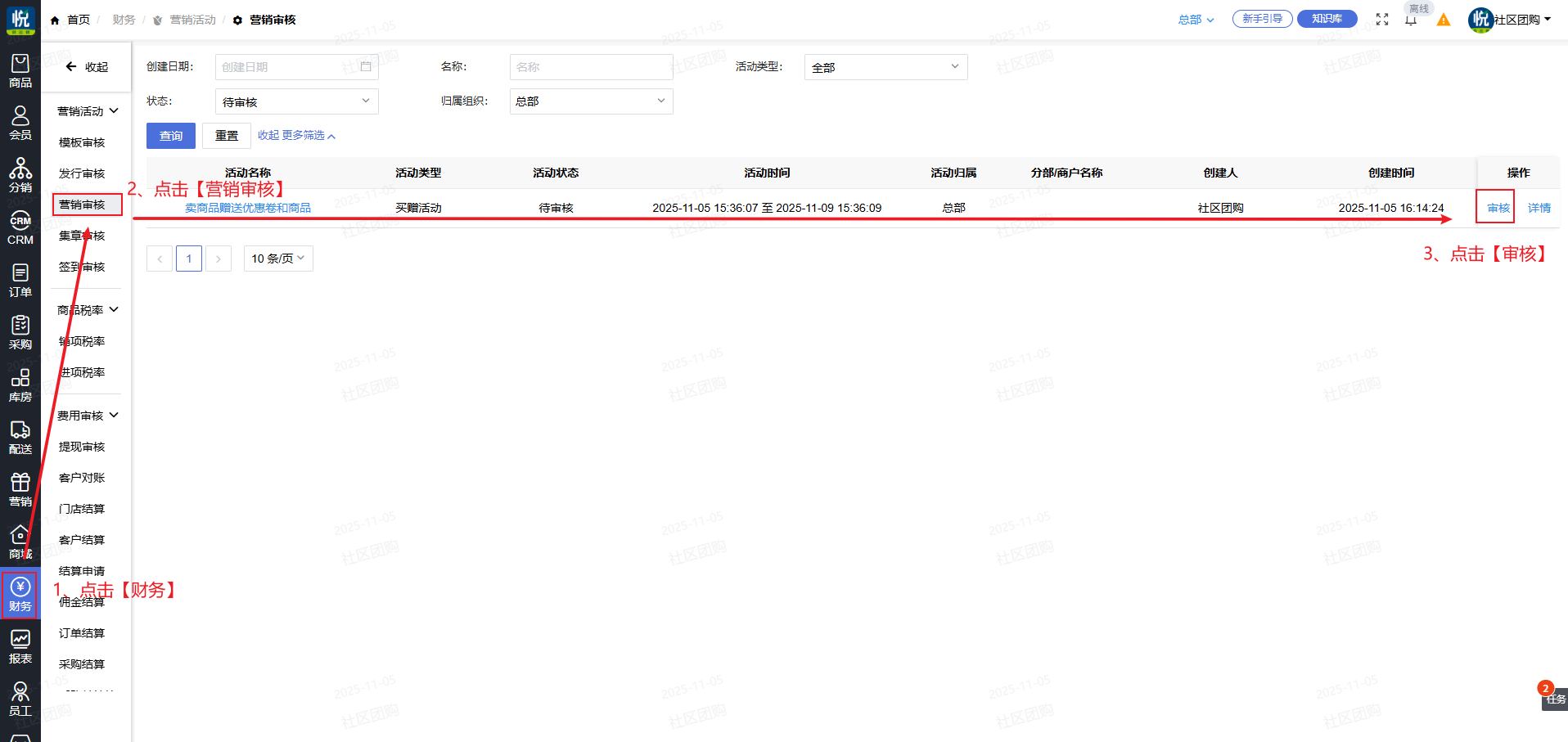 7.在导航栏中点击【财务】-【营销审核】-【审核】