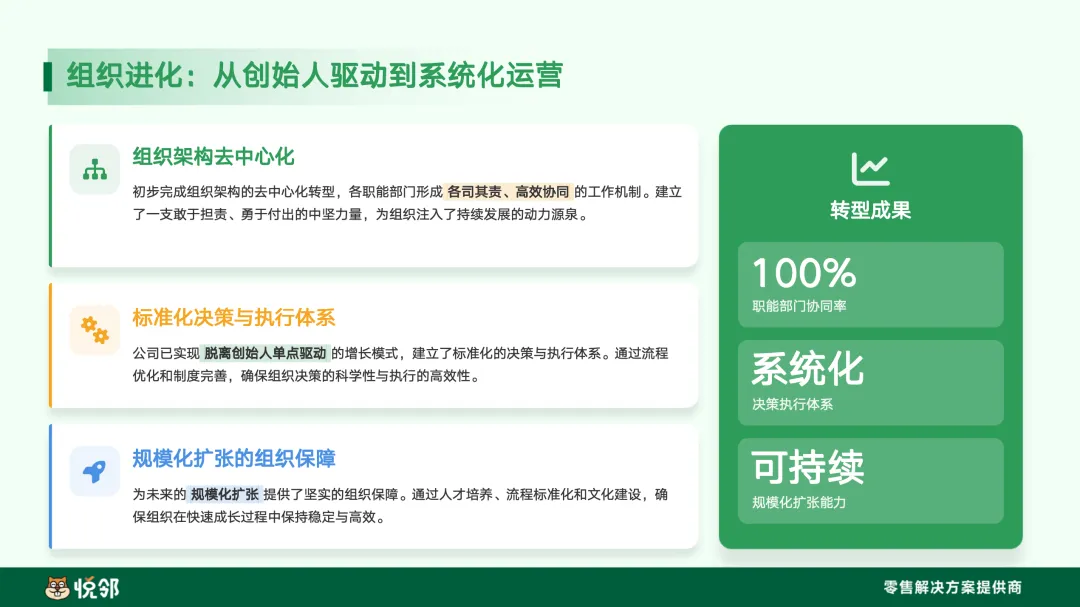 目前,公司已实现脱离创始人单点驱动的增长模式,建立了标准化的决策与执行体系,为未来的规模化扩张提供了坚实的组织保障。
