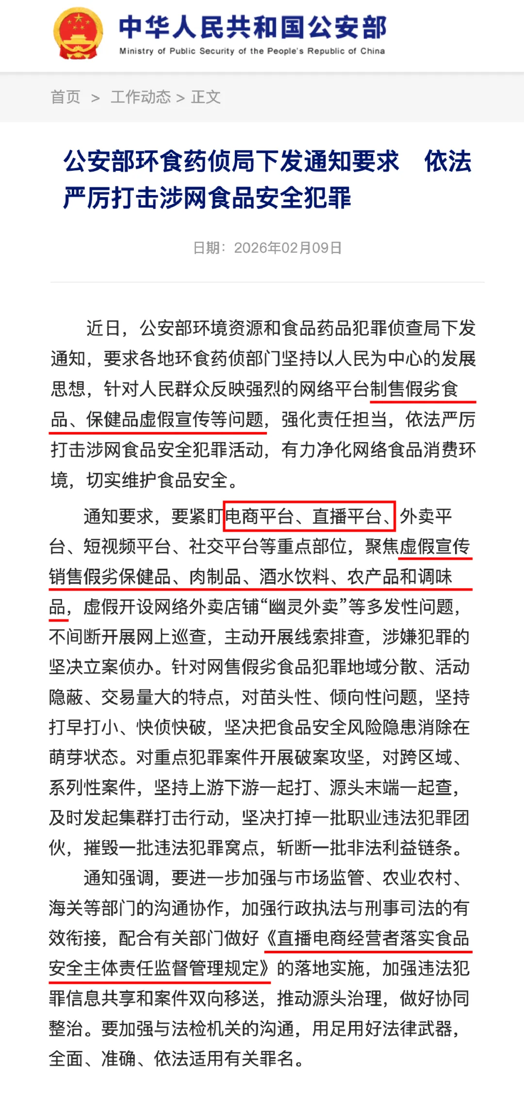 2026年2月9日,公安部环境资源和食品药品犯罪侦查局下发全国性通知,明确要求各地依法严厉打击涉网食品安全犯罪。